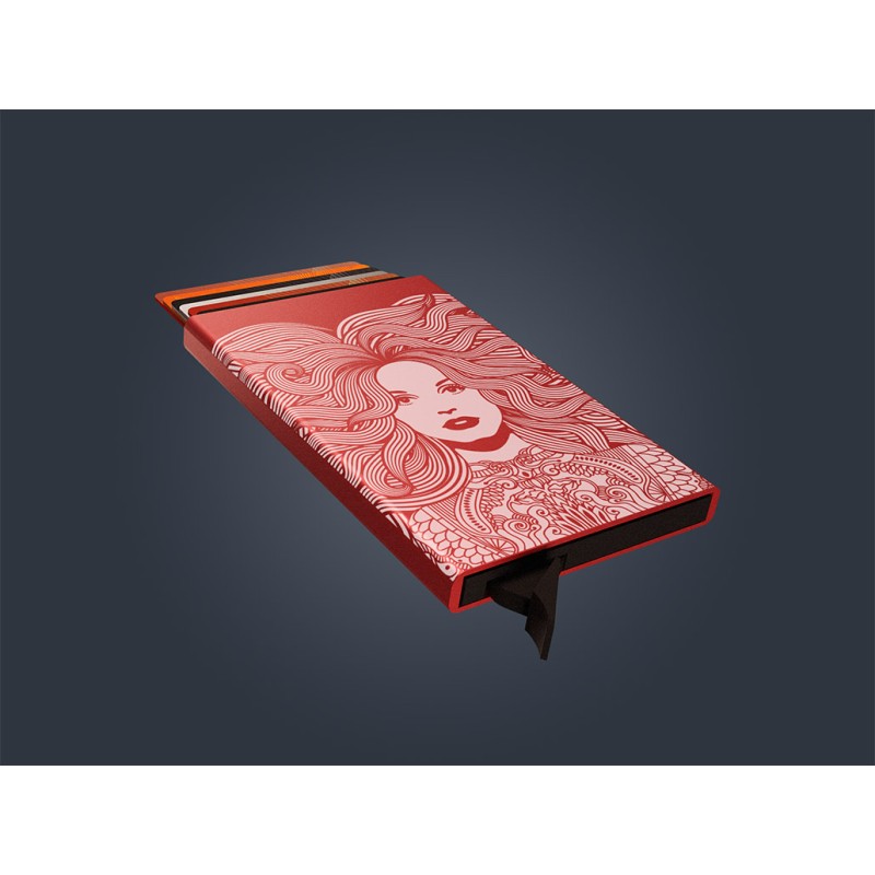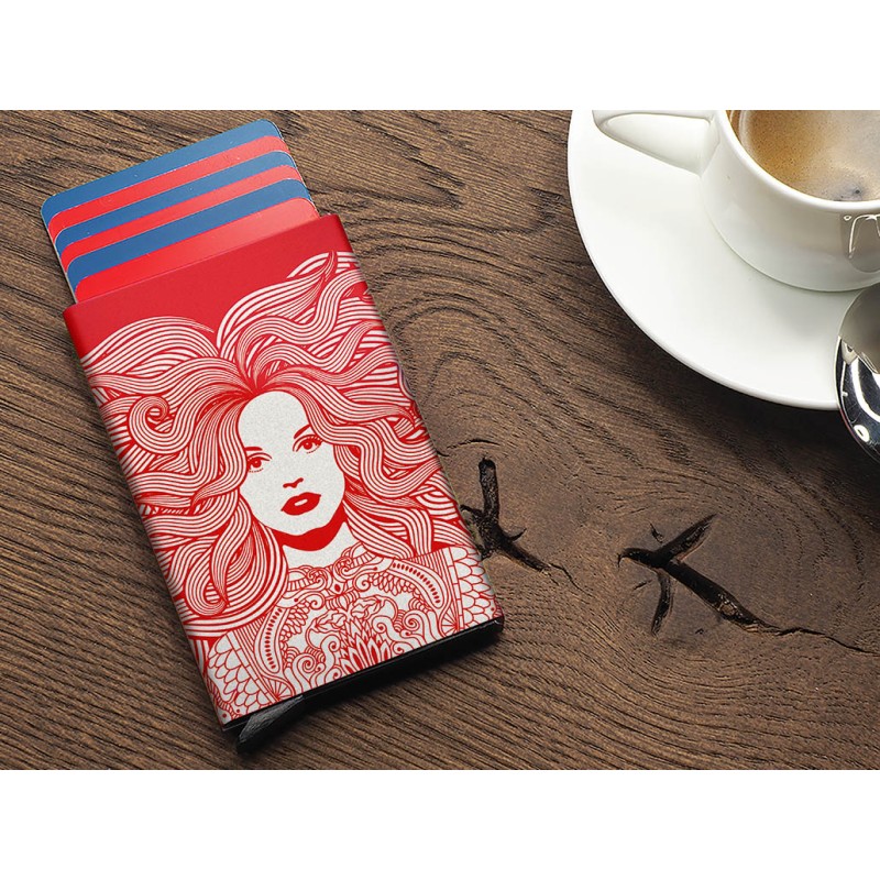 Credit card case, made of solid aluminium. Decorated with a colourful portrait in the style of 1960s posters.