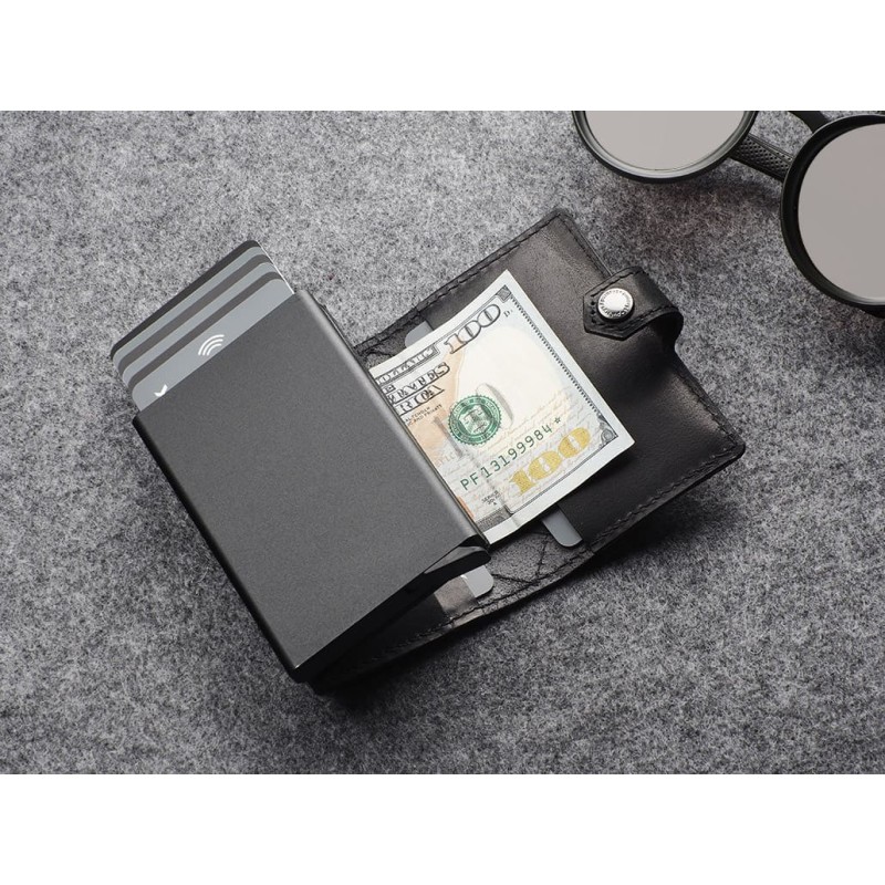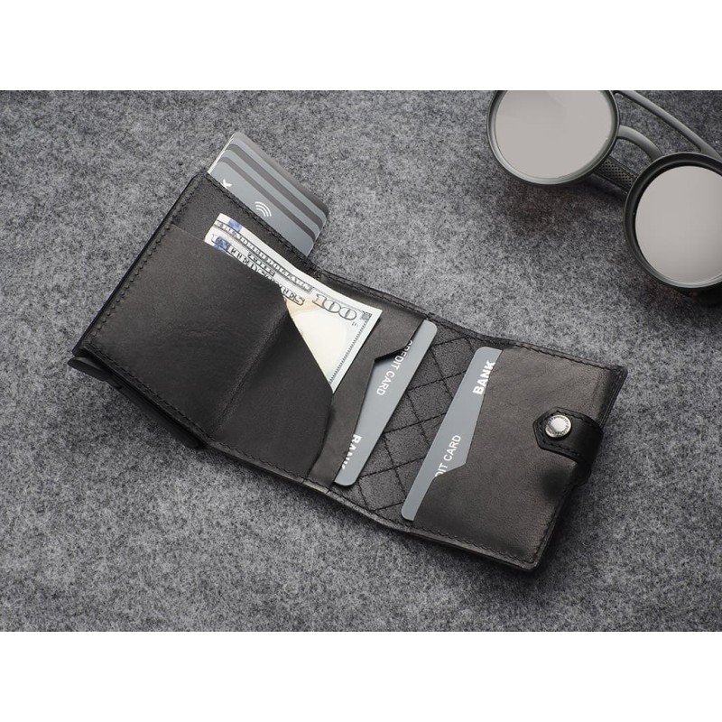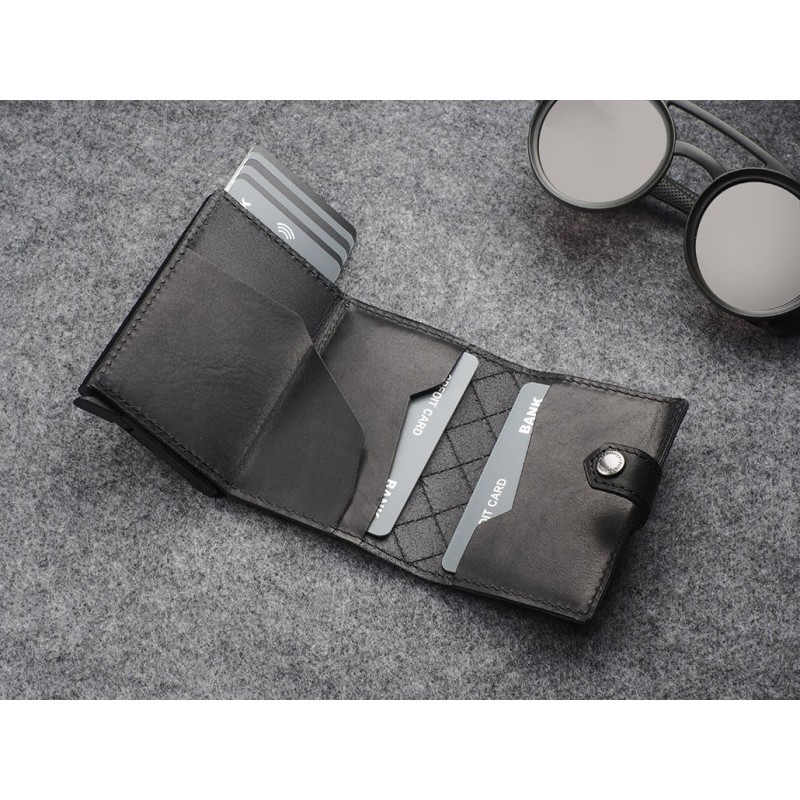 Keep your cards and notes close at hand, organised in two easily accessible pockets. An elastic band for notes and more is an added convenience. Thanks to the RFID technology used in the wallet design, your sensitive data and credit card funds are completely safe and protected from unauthorised reading or theft. The special gradual card ejection mechanism allows you to quickly reach for the one you are looking for. Registered design - unique and original!